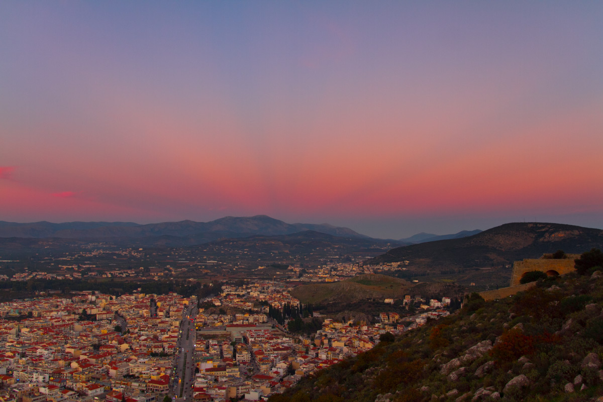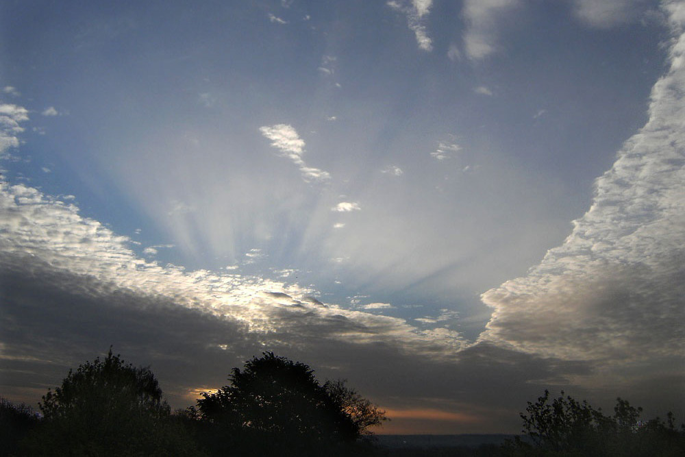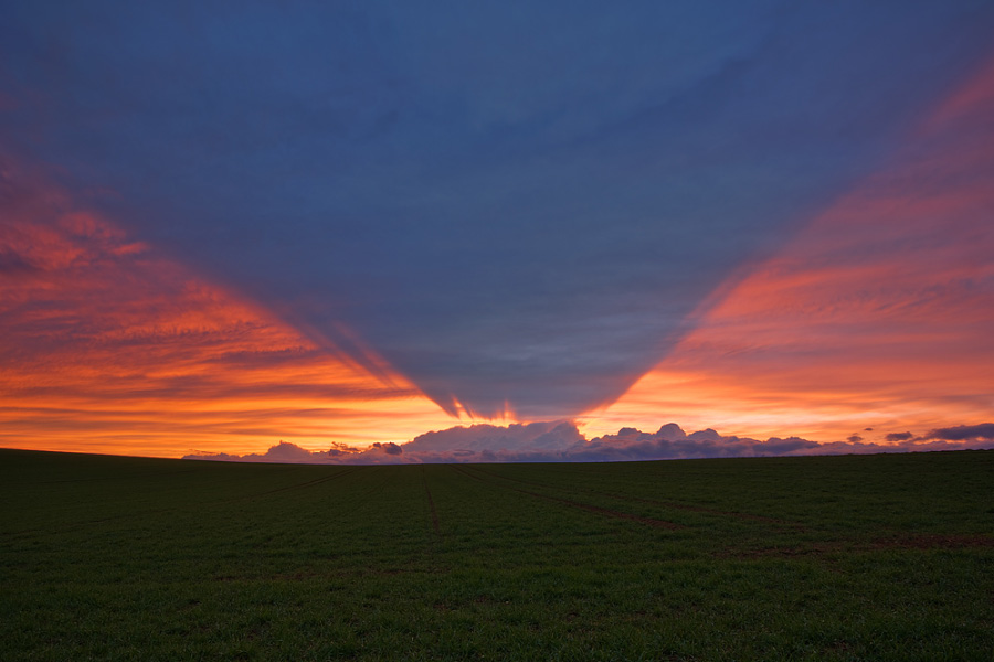 If the sun is low on the horizon or has just set, the light and shadow rays can extend across the entire sky (twilight rays) and converge at the antisolar point (antisolar rays).