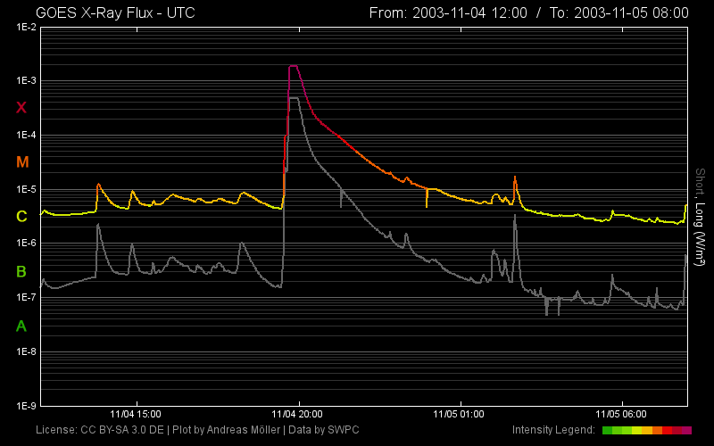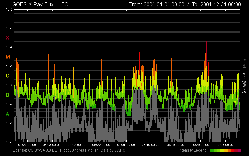 Flares are eruptions on the solar surface where radiation (including X-rays) is emitted and material (particles) is expelled, known as coronal mass ejections (CME). The X-rays travel at the speed of light and can be measured by satellites a few minutes after the eruption. These outbreaks appear in the diagrams of the GOES satellites as a sudden rise in the curve and end in a "peak". The more intense an eruption, the more the peak shifts into the red area. The peak of the peak is considered