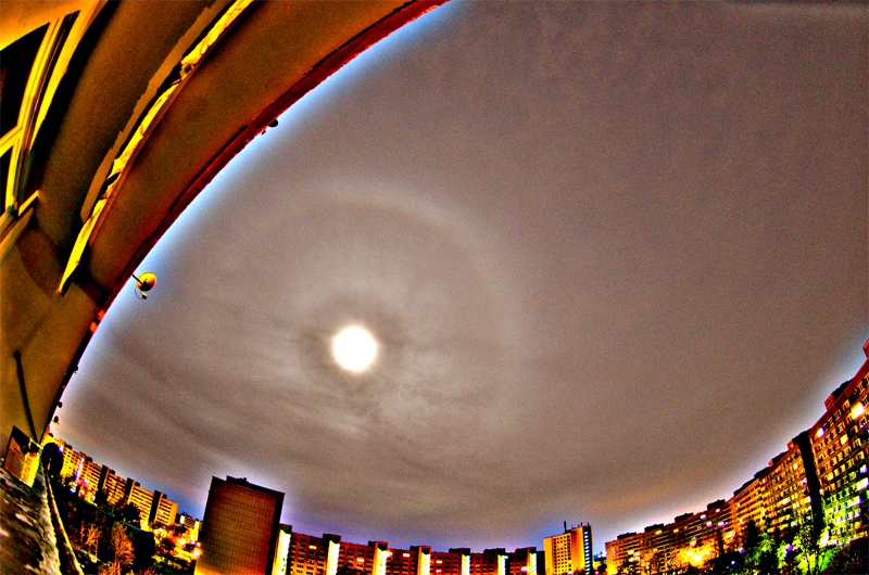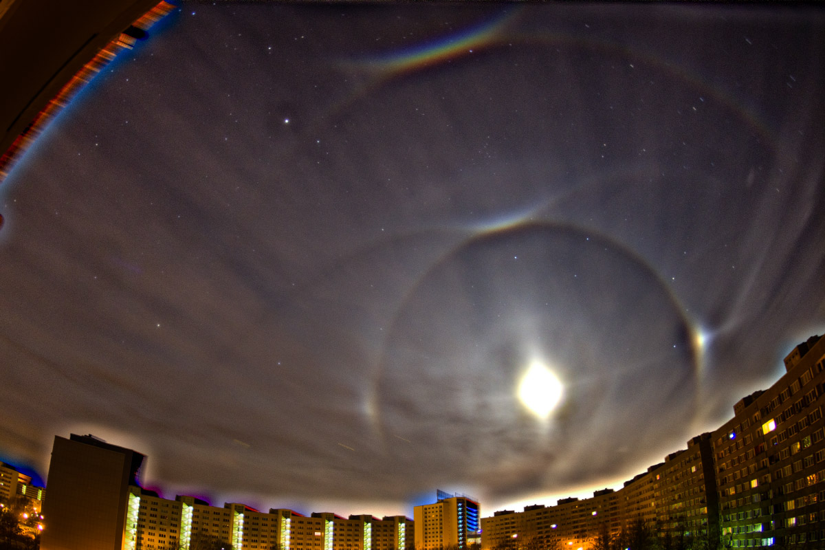 However, the actual peak of halo activity was expected to be reached the following night. Since 21:00, a weak 22° ring was present on the moon. From 21:50, a 9° ring was also detectable photographically. Around 23:30, this was easily visible with the naked eye, with a brightening on the lower edge, i.e., the 9° parry arc. Encouraged by this, Alexander set up his camera on the balcony railing for a time-lapse shot, covering the next almost 4 hours (from 23:49 to 03:42). Occasional visual observations were made coming from light without full dark adaptation. The 9° ring was very clear until 03:00, and additionally, the side areas seemed brightened (an indication of the 9° column arcs). The 22° ring appeared strangely diffuse due to the presence of other pyramidal halos. On its upper edge, a diffuse combination of circumscribed halo / OBB and 23° parry arc or Parry arc was visible. The latter two types are difficult to distinguish, but since no other effects of parry-oriented crystals (e.g., moonbow) were detectable, whereas other pyramidal plate arcs were, a Parry arc is probably to be excluded.