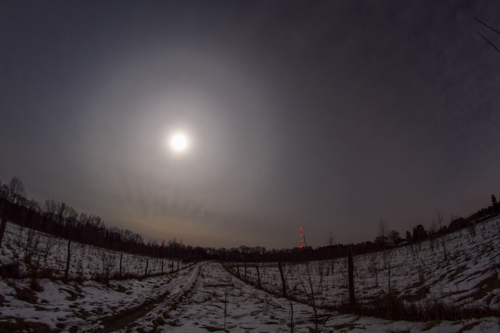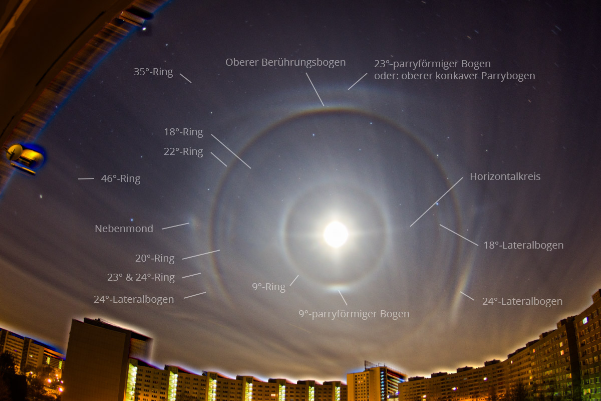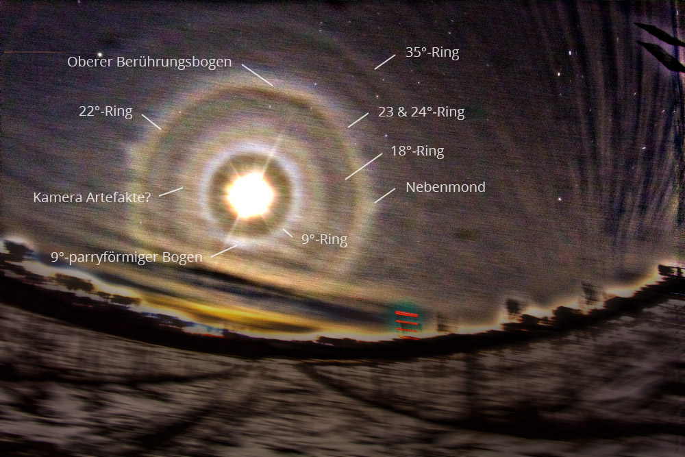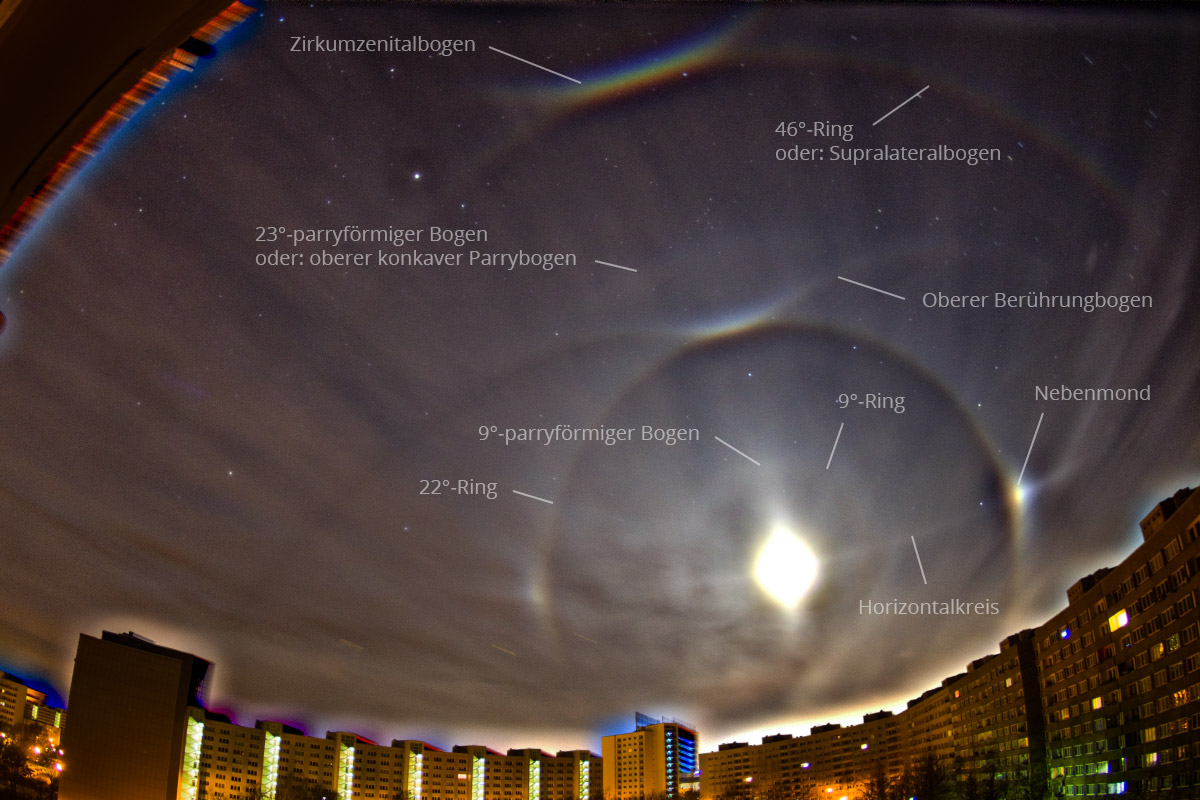 In the same night, Andreas Möller was also able to observe an atmospheric moon halo in Wildau. The 22° halo, both sundogs, the upper tangent arc, the circumhorizontal arc, and a faint 9° halo were visible. Thus, it just achieved a halo phenomenon. With the help of image processing (USM), the circumzenithal arc became visible.