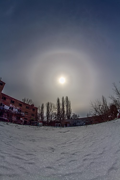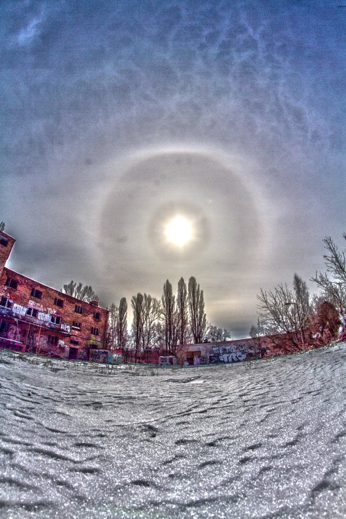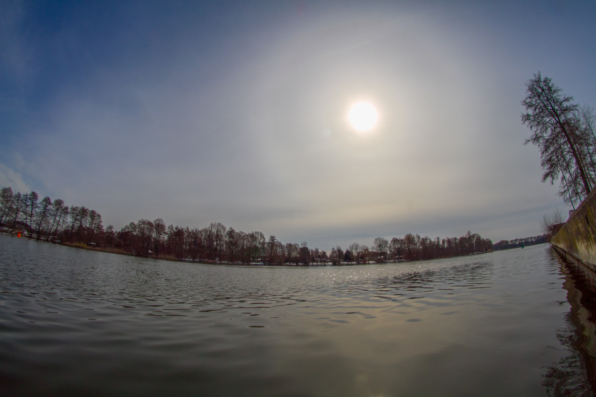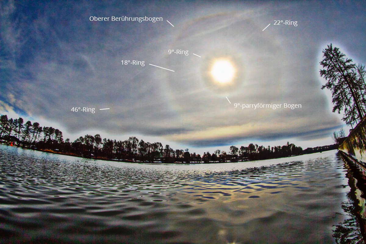 The following day, the morning in Wildau began again with pyramidal halos. At the Dahme, Andreas Möller observed the 9° ring, the 22° ring, the upper tangent arc, and both 22° parhelia from 10:30. The halos were mirrored in the river. Through the application of USM, a fragment of the 46° ring, as well as the 18° ring, was revealed in the image.