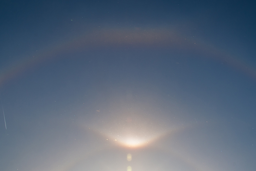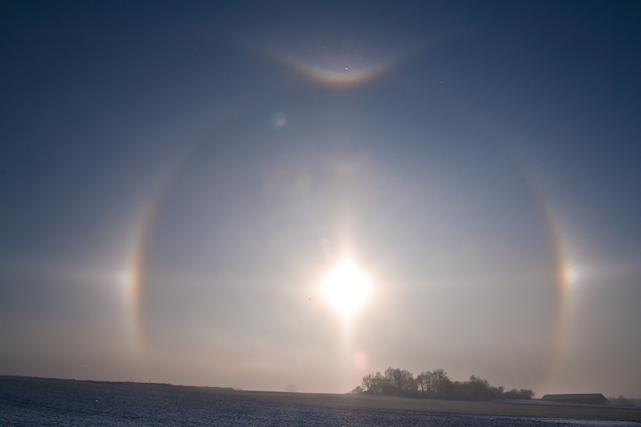 Cold January day after a clear icy night (eastern location), at the time of the halo phenomenon still about -5 to -7 degrees. There is only a little snow.