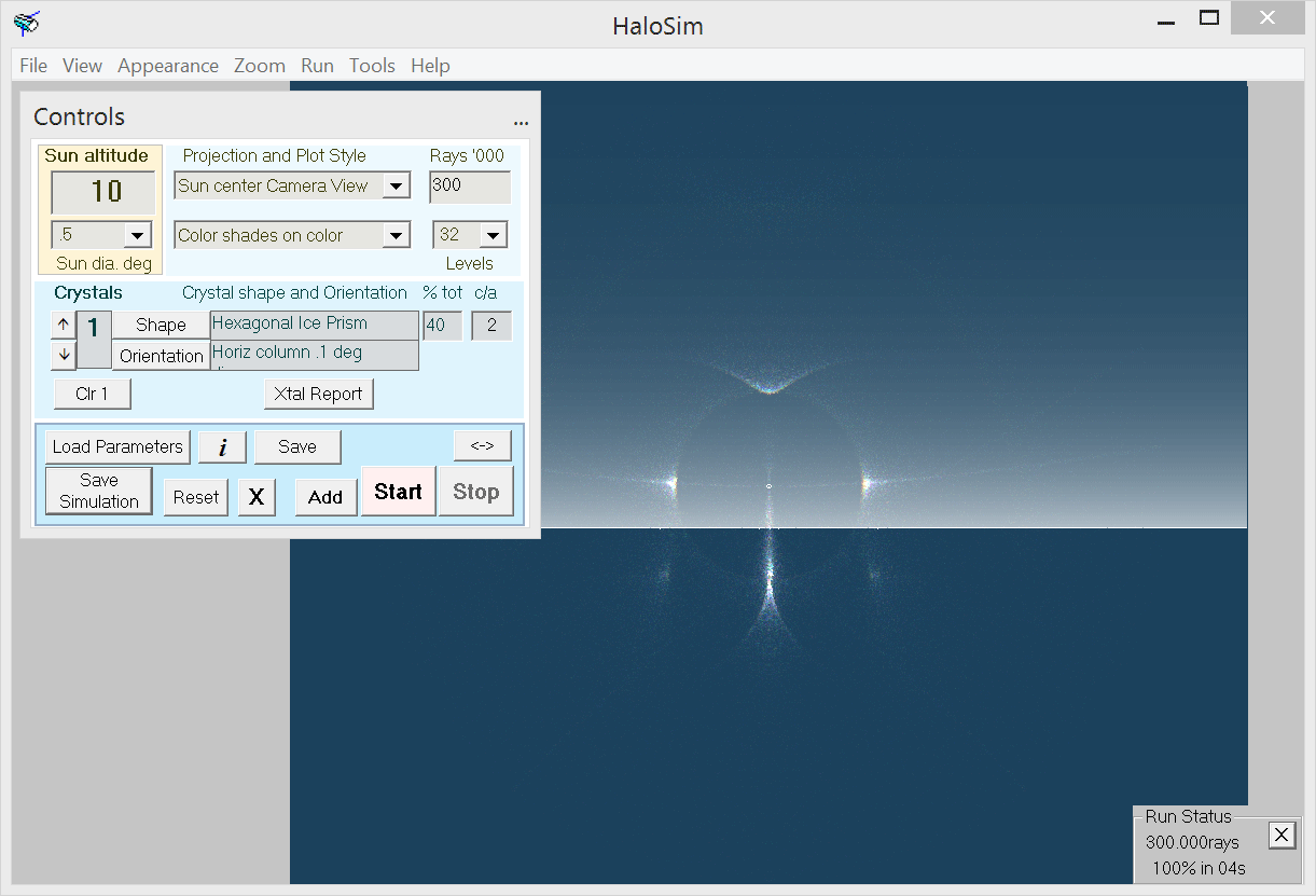 The software HaloSim was written by Les Cowley and offers a lot of settings: crystal types, orientation, number of different crystals, camera projection, and, and, and...
