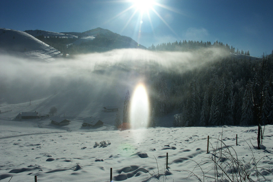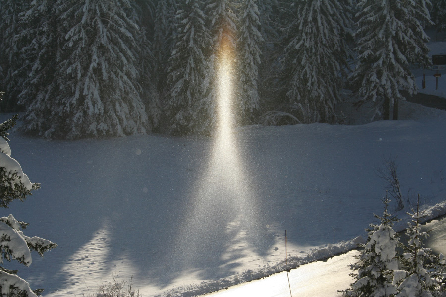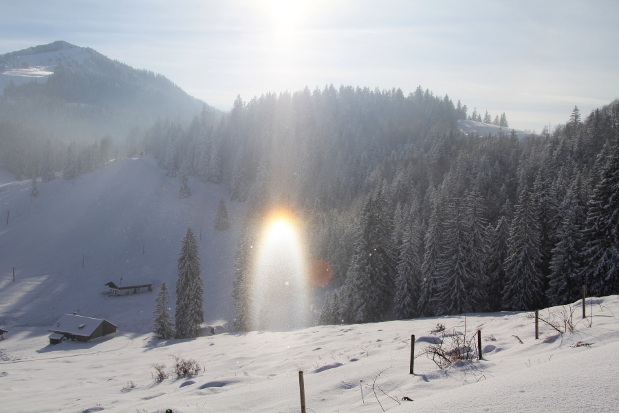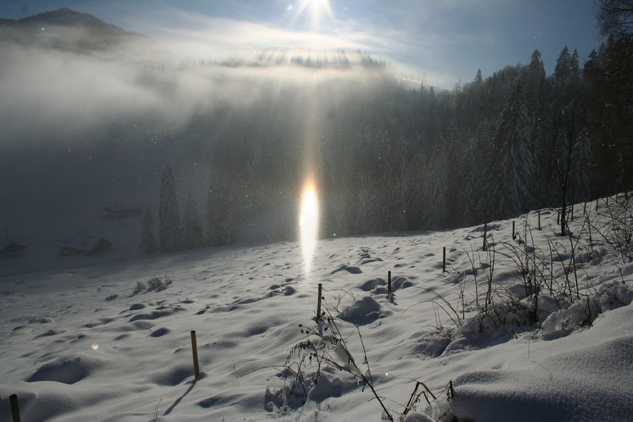 22° halo lies a type of halo that can take on various forms. Depending on the sun's altitude, a different image emerges. At a sun altitude of up to 32°, this halo phenomenon is called the lower and upper tangent arc of the 22° halo, and at sun altitudes above this, it's called a circumscribed halo. When the sun is low, the two branches of the