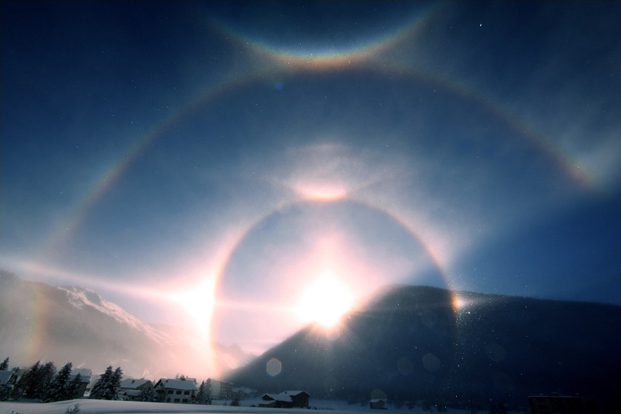46° ring at the sides. When the sun is on the horizon, the contact points with the 46° ring are at solar height. At a solar altitude of 15°-27°, the supralateral arc almost coincides with the 46° ring, making it very difficult to distinguish. In fact, many observations of the 46° ring seem to actually be sightings of the supralateral arc. It is only from a solar altitude between 27° and 32° that the supralateral arc is significantly higher than the 46° ring. Moreover, the