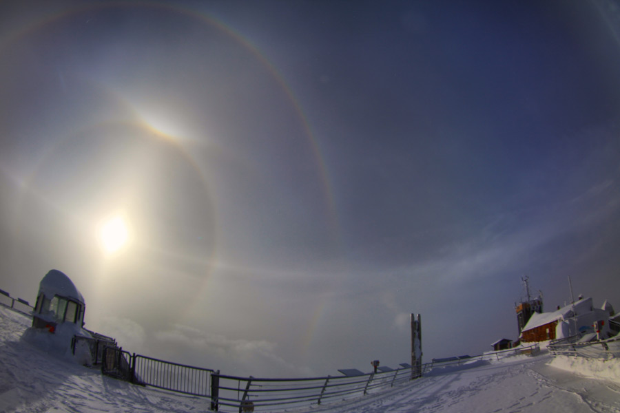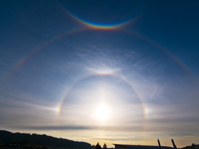 circumzenithal arc also provides a clue for differentiation, as the circumzenithal arc touches the supralateral arc at all solar altitudes. However, this also applies to the 46° ring at solar altitudes between 15° and 27°. Another distinguishing feature can be the stronger coloration of the supralateral arc. The 46° ring is usually only white or has a weak reddish inner edge. The supralateral arc, on the other hand, is much more strongly colored. Blue and green are also clearly visible. Its coloration and brightness can match that of the